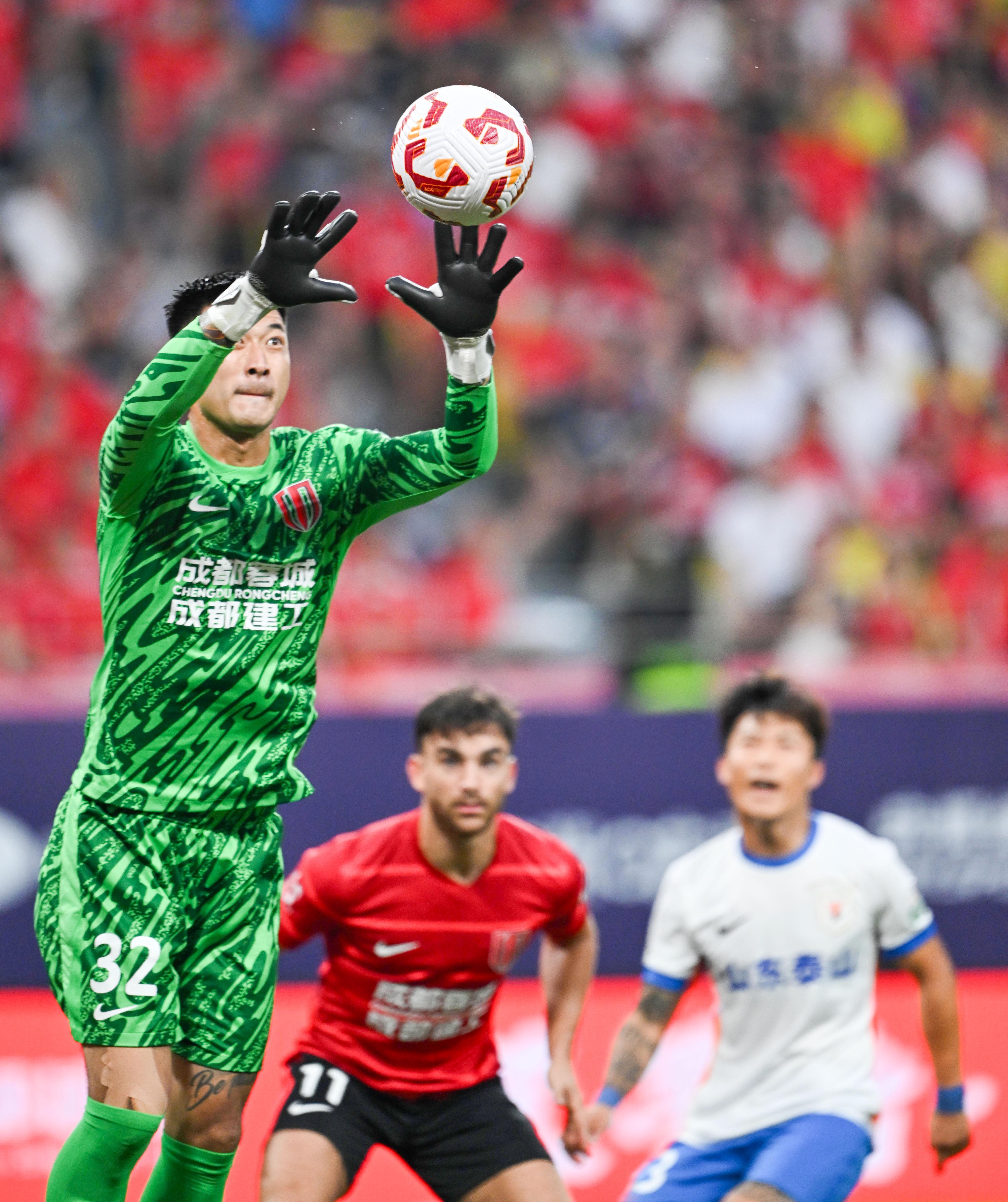 ↑2025年8月2日,成都蓉城队守门员刘殿座(左)在中超第19轮比赛中扑救。新华社发(尹钢 摄)